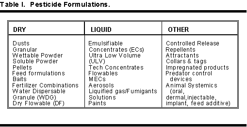 Pesticides can be classified four different ways: formulation, target, mode of action, and chemistry. Table I shows several common formulations. Table II shows pesticide targets or sites of use. Table III shows modes of action. Table IV shows some pesticide chemistries.