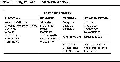 Table II shows pesticide targets or sites of use.