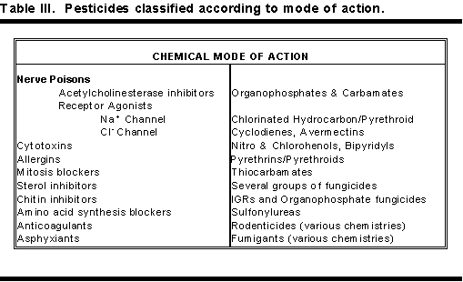 Table III shows some pesticide modes of action. The nerve poisons include several modes of action. The largest number insecticides are cholinesterase inhibitors. Several herbicides, fungicides and plant growth regulators also are cholinesterase inhibitors. These include the organophosphates and carbamates.